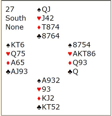 Men hvordan spille nå, ikke trumf i hvertfall. Sikkert mange veier til Rom, men pass uansett på forbindelsen som er i nettopp trumf. 2 ganger ruter er mulig, sitter da alt og du finner ut av hjerteren så står dette med en taper i ruter, en i trumf og en i hjerter. Men er du riktig på hugget, prøv hjerteren med en gang. Normalt best å spille på hjerter dame i kapp, og her sitter både hjerteren rundt og dame foran. Pass på rekkefølge og det er 11 lette stikk. Bare prøv eller arrester meg.