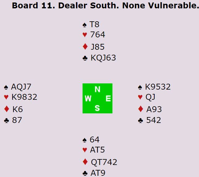 Nå kunne ikke kontrakten betes, Vest tok sine 3 sparstikk og prøvde en desperat liten hjerter, men nå tok Syd resten. -430 og 7 IMP til England, da N/S stoppet i 3♦ ved det andre bordet og fikk 11 stikk. Men hvis du fant hjerterskiften, tar dere de første 8 stikkene og vinner 8 IMP isteden.