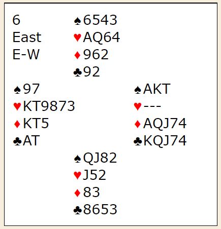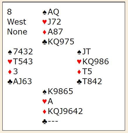 En ser jo i ettertid at Ø/V vinner 6 ruter, ja faktisk kan de vinne en usannsynlig 6 spar også siden spar sitter 3-3. Men det er nok ikke en opplagt slem med 30 HP til sammen, og det er omtrent umulig å melde slem etter syds åpningsmelding.
