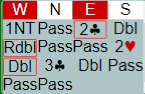 Ø/V var altså nesten i 2 kløver redoblet, og der ville det blitt mange stikk! Det kan jo tas syv toppstikk i sidefargene (da regnes to ruterstikk), minst en hjerterstjeling kan tas hos vest, og det blir fort et par trumfstikk til, selvsagt. Så der kan det bli et par redoblede overstikk, vi snakker +1160 eller mer sannsynlig +1560 til Ø/V.