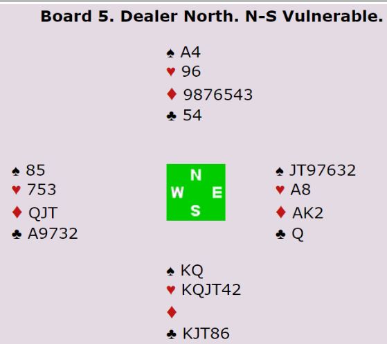 Det skal mye til for at 7 ruter skal gå bet med dette, i så fall må sparfargen sitte skjevt (6-0 eller 5-1). Slik det så ut var det absolutt ingen problemer med å vinne 13 stikk og notere +1440.