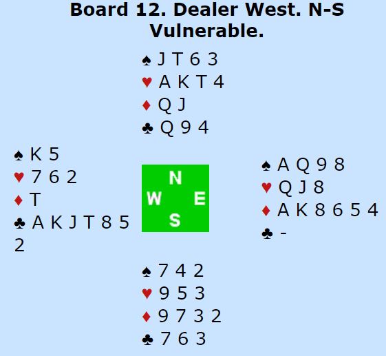 I en eventuell stamp i 7 hjerter blir det kun tre bet og +500 til Ø/V. Så et visst håp om stort gevinstspill (14 IMP) var det da spillet startet ved det andre bordet, men dessverre gikk meldingene akkurat likt. Dermed ble det uavgjort spill og sluttresultatet i kampen ble 7-5 (10,61VP). Etter elleve kamper ligger Norge på 6.plass.