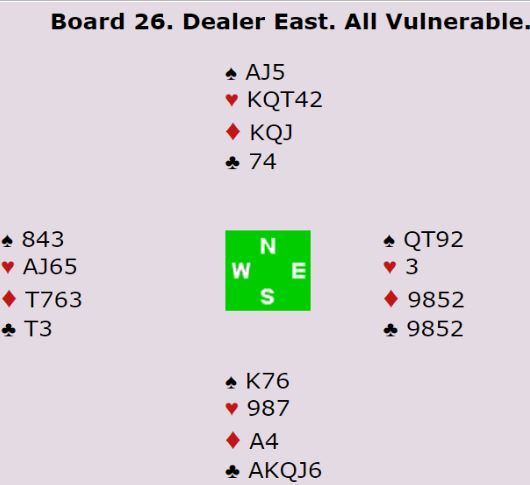 På EKkn i kløver forsvant det to rutere og en hjerter fra Nord, og etter hjerter til Esset og hjerter til stjeling med spar 8, kunne Nord trumfe seg tilbake på hånden med en ruter og presse ut spar Dame. Flere stikk kunne ikke Ø/V få, og dermed ble det +980 til N/S og 14 IMP til Norge. Ved det andre bordet gjorde nemlig Tor Eivind Grude det enkelt ved å spille ut ♦3 mot 6♠. Han fikk en rask ruterstjeling og hadde fremdeles et sparstikk. 2 bet og seier med 30 IMP.