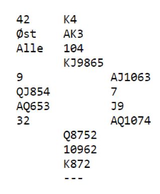 Stein åpnet med 1 kløver, og vest meldte inn 1 hjerter. Jon-Egil sa 1 spar som for dem betyr maks trekorts spar. Stein kom tilbake med 1NT, og vest hoppet til 3 kløver. Jon-Egil foreslo 3NT, og det lå et lite øyeblikk an til uavgjort spill. Men så sannelig mente vest at han burde melde enda en gang og sa 4 kløver! Da mente Jon-Egil at det fikk være nok og doblet.