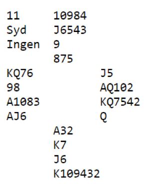 Noen åpnet med syds kort, og det synes ikke jeg kan kritiseres med den fine fargen og 11 poeng. Det gjorde det vanskelig å finne frem til slem Ø/V, men om det åpnes er alle storkortene plassert for spillefører. Andre passet med syds kort, men meldte senere.
