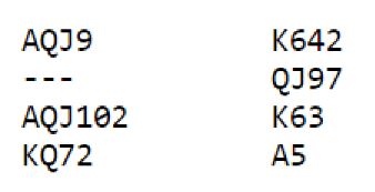 Som du ser er det ved å se kun på N/S sine kort suverent i 6 spar. Det sitter komfortabelt 3-2 i trumfargen spar, og etter å ha trumfet ut i tre runder kan hjertefargen brukes for avkast av to rutere og en kløver. Det blir kun ett kløverstikk til forsvaret, og ruterfinesse er unødvendig. I hjerterkontrakt som det er mer naturlig å havne i er det kun elleve stikk fra taket, det tolvte kan kun komme via en vellykket ruterfinesse.