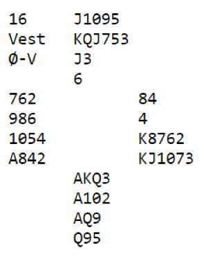 Og det var på ingen måte opplagt å bete denne 4 hjerteren, eller bete 3NT spilt av nord som var kontrakten noen få steder. Nesten halvparten av N/S parene vant sin utgang.