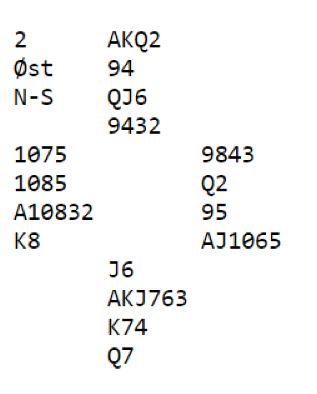 Vel, en må si det var mildt sagt heldig. Jeg har ikke fått tak i informasjon om hvordan de to parene unngikk spartilpasningen og noterte kalasscorene +1390 og +2140. Men litt kvalifisert (kanskje?) gjetting tilsier at det startet med 1 ruter fra vest og 1 hjerter innpå fra nord, så meldte øst en «praktisk» 3NT med den fine hjerterbeholdningen bak innmelderen. Det er ikke teoretisk sett helt korrekt meldt. Det kan jo godt gå pass rundt på 3NT etter denne starten, så har vest firekorts spar og et par-tre små kløvere. Og om syd har kløverutspill er de i så fall fort i feil utgang. Men det er jo lov å være litt praktisk av og til?