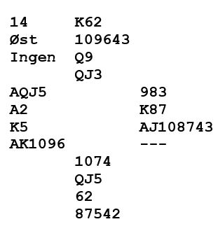Fra parturneringen tar vi med et spill hvor det meste ble avgjort i meldingene. Du kan først ta stilling til øst sin første melding. Du er giver med ingen i sonen og har disse kortene: