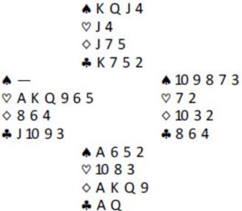 Syd åpnet med 1 ruter. Vest gikk innpå med 1 hjerter, og nord doblet for å vise firekorts spar. Øst passet, og syd meldte 4 spar før det gikk pass rundt.
