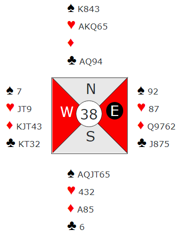 Om syd skal ta vekk bordets siste trumf, går det på bekostning av trumfstikket. Dermed må øst enten få seks trumfstikk på hånda og ei stjeling i bordet, eller eventuelt syv trumfstikk på hånda. Resultatet blir uansett syv stikk og fem beit for scoren 1100 ut. Det tilsvarer 7 IMP i den norske kolonnen når man sammenlikner med 1390 fra det andre bordet.