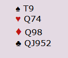 Christian valgte å spille ut liten hjerter, og da var det ikke lenger mulig å beite kontrakten da hele spillet så slik ut: