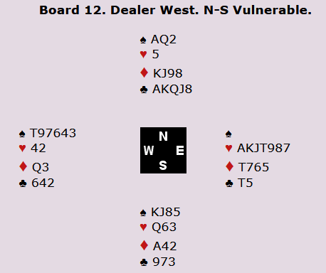 Siden hjerterfargen sitter 3-2 står det også tretten stikk i grand, men å melde 7NT er gambling. Ett par var i 6NT med tretten, men det ga godt under middels selv om de slo en del par som var i i 6 spar. Nederst på listen finner vi imidlertid et par besynderlige resultater: