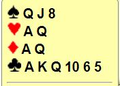 Å si 3 kløver kan vel fungere, men selv tror jeg det er greit å få vist denne hånden som en kruttsterk NT-hånd, 25-27 poeng. I gammeldags stil vises det med det et hopp til 3NT som jeg synes er greit nok om systemet er slik. Mer moderne meldesystemer har såkalt Kokish til rådighet hvor 2 hjerter er tvetydig, enten hjerterfarge, eller en balansert hånd med 25+HP. Om det går 2K-2R, 2H sier som regel svarhånden 2 spar som avventende melding, og åpneren melder 2NT med den kanonsterke grandhånden, eller melder noe annet, dvs. en sidefarge eller 3 hjerter hvis 2 hjerter var meldt med hjerterfarge.