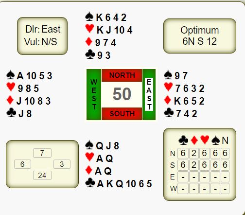 Men nei. Kun fire av 13 N/S par meldte lilleslem. Alle fire kom i 6NT som ikke bød på problemer slik det satt. Det blir bet i slem om det er en kløvertaper, men slem er glimrende. De ni andre N/S-parene spilte utgang i grand eller kløver.
