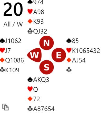 En god del par noterte utgang N/S. Det skjedde ved at nord ble spillefører i 3NT og fikk enten liten hjerter ut til singel dame, eller liten ruter ut. Ingen klarer å spille ut hjerter konge, et usannsynlig utspill som ville ført til fire bet i 3NT!