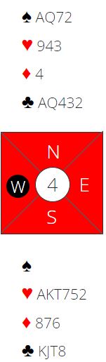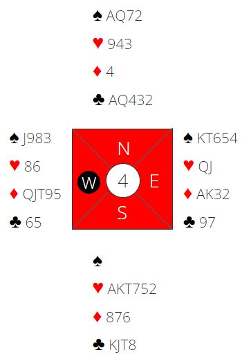 Så meldingene starter nok med 1 kløver og 1 spar innpå fra øst. Da sier syd 2 hjerter, naturlig rundekrav. Nord støtter hjerteren. Nå vet ikke N/S hvor gunstig det står til i ruter. De vil normalt stoppe i utgang selv om det gjøres et optimistisk slemforsøk, for da finner de ut at de manger både ett nøkkelkort og trumdamen. Det er dessuten mulig at vest med bra spartilpasning vil være med i meldingene også.