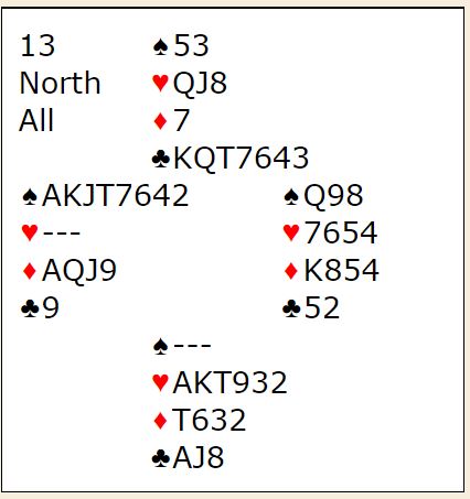 I 6S har man den fordelen at en hjerter kan kastes fra syd på ruter, så et eventuelt hjertervalg behøves ikke. På den annen side er 6S sårbart og går ofte bet om en motstander har fire spar da det som regel gir to spartapere. Kontrakten 6H er veldig bra, den kan godt stå selv om det blir en hjertertaper. Også i 6NT er det svært gode muligheter. Først kan hjerteren løse seg, og i så fall blir det tolv eller tretten stikk i NT. Om det bommes i hjerter er det to andre sjanser, spar dame kan sitte singel eller dobbel, eller en kan til slutt prøve kløverfinessen. Det er også skvismuligheteri NT kontrakt om det blir en hjertertaper, men da må det gjettes på sitsen.