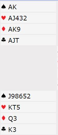 Flere steder var fortsettelsen to store rutere med hjerteravast, så K-A i hjerter og hjerter til stjeling. Øst fulgte som du ser farge. Dette var igjen: