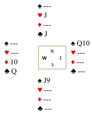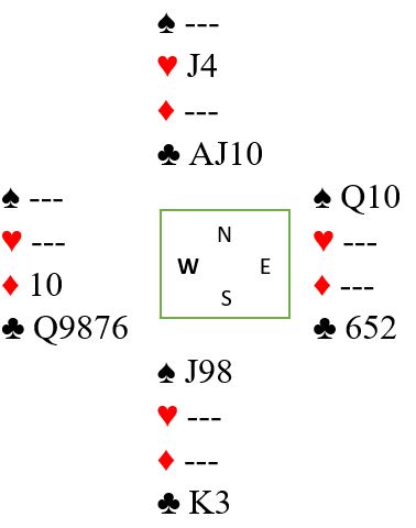 Problemet nå er at det er ett inntak for lite til nord til å få kortet syds trumf en gang til og deretter komme seg over til nord for til slutt å kunne spille et kort mot J-9 i trumf gjenværende slik at øst blir sittende i mellom med Q-10 i trumf. Det løste noen ved å ta en leken kløverfinesse med kløver 3 til tieren! En unødvendig finesse siden det jo ikke er behov for ekstra stikk i fargen, men det er behov for ett inntak til. Inne på kløver 10 kunne en hjerter til spilles. Øst kastet kløver, og syd stjal! Så kløver konge til esset (!) og dette var igjen: