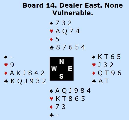 Det avhenger selvsagt av utspill og motspill. For eksempel kan det fort bli tolv stikk i hjerterkontrakt N/S. I teorien kan selvsagt vest underspille ruteren sin til østs dame og få seg en sparstjeling. Men der det ble spilt hjerterkontrakt ble det stort sett tolv stikk. Tre av de som fikk spille kontrakt N/S var i 6 hjerter doblet med tolv stikk, N/S +1210. Mange fikk spille ruterslem som Ø/V. Der Ø/V gikk på til 7 ruter var det ikke unaturlig for N/S å stampe i 7 hjerter som jo må være billig i stedet for å risikere at Ø/V vinner storeslem. Men i teorien er det kun ti stikk i ruterkontrakt hvis vest er spillefører. For at det skal bli så få stikk må nord spille ut kløver til stjeling, hjerter over til nord og nok en stjeling. Men de fleste fikk tretten stikk i ruterkontrakt, mange steder spilt av øst.