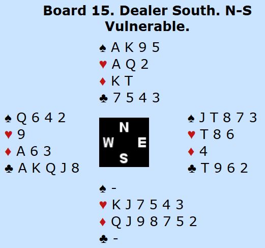 I Norge sin pulje var det omtrent delt mellom utganger og slemmer. Ett "uheldig" N/S-par spilte i Exlusion Blackwood (eller kanskje de spilte i Cuebid) da de havnet i tullkontrakten 5 kløver på 4-0 tilpass, og de gikk fire bet. Fem par gikk bet i slemmer (6 hjerter eller 7 ruter), og resten var i utgang. Noen steder var utgangen doblet med postnummer-score.