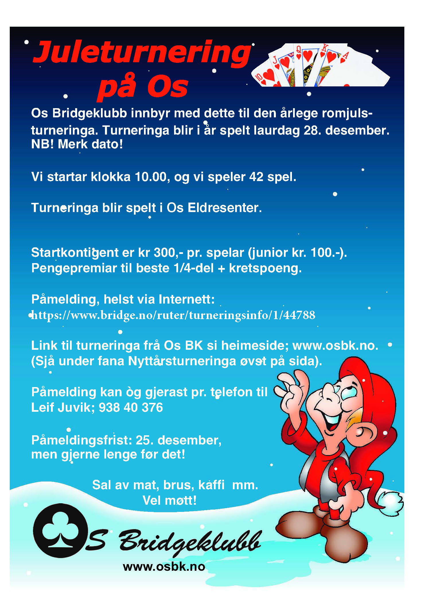 Den tradisjonsrike juleturneringa vår blir spelt i eldresenteret laurdag 28. desember. Meld deg på alt idag! vel møtt! Klikk biletet for info. Last gjerne ned og send innbydinga til alle som kan vera interessert. Vi satser på fullt hus.