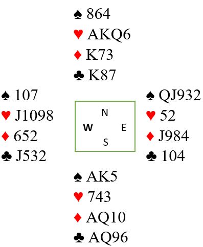 Det står i tolv stikk i NT. Storeslem er avhengig av full uttelling både hjerter og kløver. Ikke uventet var en del N/S-par optimistiske og meldte 7NT som gikk en bet. Faktisk fikk ca. 40% av Ø/V-parene +100 for hente en bet i 7NT, og det ga +45 av +68 oppnåelige poeng til Ø/V. De aller fleste spilte 6NT og noterte +1440 som ga +29 til N/S. Det var noen få utganger også samt to par som må ha hatt misforståelser da de spilte delkontrakter.
