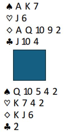 Etter å ha startet med A-K i spar ble det helt feil i denne utgangen som fra start så ut som ville kunne ende med ett overstikk. En desperat spillefører fortsatte med ruter fra topp i håp om at vest fulgte farge lenge slik at ruteren kunne gi avkast. Men vest kunne trumfe allerede i tredje runde ruter og spilte seg fri med spar knekt. Dermed var spillefører låst på hånden og fikk to hjertertapere – to bet!