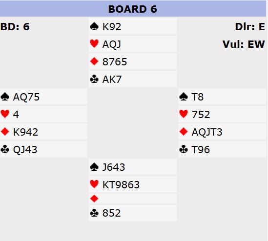 6NT er en bra kontrakt. Ruter konge kunne jo vært plassert hos vest, og hjerter konge kunne også vært fordelaktig plassert for spillefører, hos øst. I så fall kunne det vært tretten stikk.