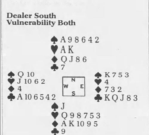 Idet det spilles til kløver i andre stikk må syd trumfe, men det må et meget spesielt avkast til fra nord for å vinne kontrakten. Spillefører må kaste hjerter ess (eller kongen)!