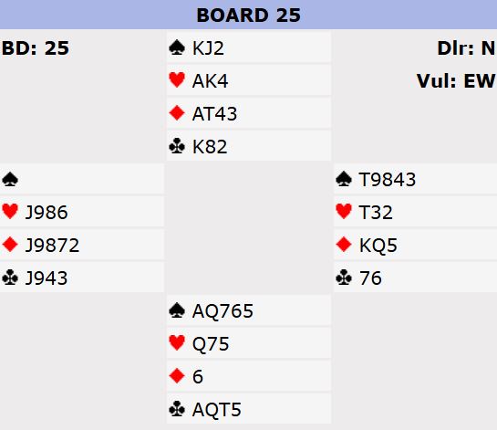 Motparten meldte ikke, og Ashley (syd) svarte 1 hjerter som viser spar (kløverføringer). Nord meldte 2NT andre gangen, 18-19. Syd som nå ville i slem meldte 3 kløver - Check Back - og fikk 3 spar fra nord, trekorts sparfarge samt at meldingen benektet firekorts hjerter. Syd gikk rett i 4NT, spørsmål om nøkkelkort (essene og trumf konge). Nord viste tre nøkkelkort, altså de to røde essene samt trumfkongen.