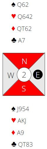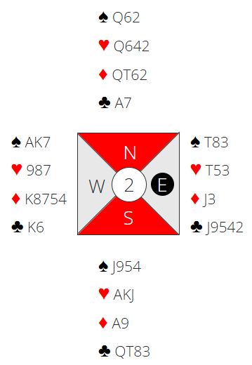Det er dog et problem med dette. Hvis spillefører er for ivrig med å spille ruter tidlig - det ser jo fristende ut etter den starten - kan vest stikke seg inn i spar og godspille ruteren sin med kongen og en til. Da er det kun 0+4+3+1 = 8 stikk. Det bør dog bli ni stikk til slutt siden vest ikke kommer seg unna. Han må kaste en spar på fjerde runde hjerter og kommer så inn i spar (A-K dobbel) bare for å måtte gi spillefører to kløverstikk.