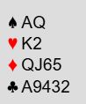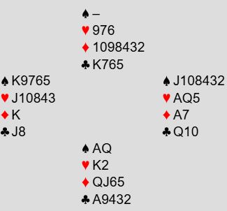 HEIMDAL BK er også som vanlig en av de store favorittene. De møtte MO BK 4, og det ble en svært jevn kamp. Idet fem spill gjenstod ledet Mo med 1 IMP. Da kom dette spillet hvor du først kan ta syd sine kort (Vest er giver, alle i sonen):