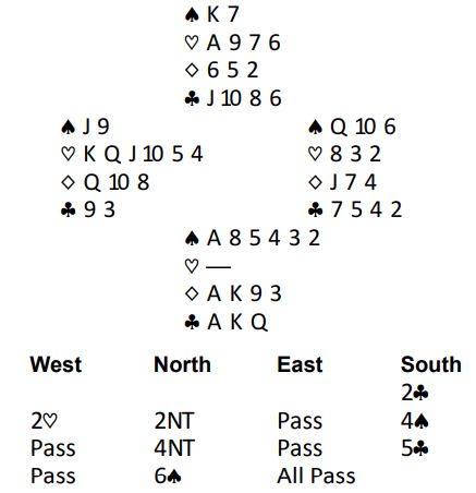 Vest har til en sterk, kunstig 2 kløver. En vanlig start på meldingsforløpet bør så være 2 kløver, 2 ruter fra øst og 2 spar fra vest som lover mindt femkorts farge. Da støtter øst sparen. Nå bør det bli slem, men å melde storeslem med full kontroll er jammen ikke lett. Slik så hele spillet ut:
