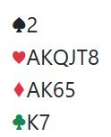 En kan telle tolv sikre nå, spar ess, seks hjerterstikk, A-K i ruter og minst tre kløverstikk. Og det må vel være en enorm sjanse for at det er tretten stikk? Makker han ha kløver knekt også, eller sekskorts kløver. Og har han bare A-Q femte i kløver kan han jo ha noe i ruter og. Eller det kan godt være en ruter-kløver skvis (samme motstander har lengden i kløver og ruter) om da kløveren ikke sitter 3-3. Alt i alt føltes det som så stor sjanse for en nedlegg storeslem, eller at den i alle fall har spill at jeg meldte 7. Men burde jeg melde 7 hjerter eller 7NT? Jeg tror det er best å si 7NT, men jeg klarte å overtale meg selv til å si 7 hjerter med den tanken at kanskje makker har hjertertilpasning og det er ett ekstra inntak i tillegg til spar til hans hånd så kløveren eventuelt kan stjeles god.