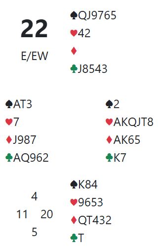 Dette ble et eksempel på å spille på skjev sits så blir det bet når det sitter snilt. Å gå en doblet bet i slem hvor det var tretten stikk å hente etter at nord på et vis bommet utspillet er selvsagt forferdelig for vest, og spesielt brutalt da spillet ble overført på BBO. Alle som ser på ler av spillefører. For de ser jo alle kortene, og da er det mye lettere. Men om en bytter en hjerter over fra nord til syd, og for eksempel en ruter over til nord ville spilleføringen vært en suksess og nødvendig for å vinne 6 hjerter.