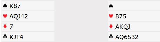 Så meldingen ble 7 hjerter. Det kom litt overrasikende liten ruter i utspill fra syd. Og slik så våre kort ut mot hverandre: