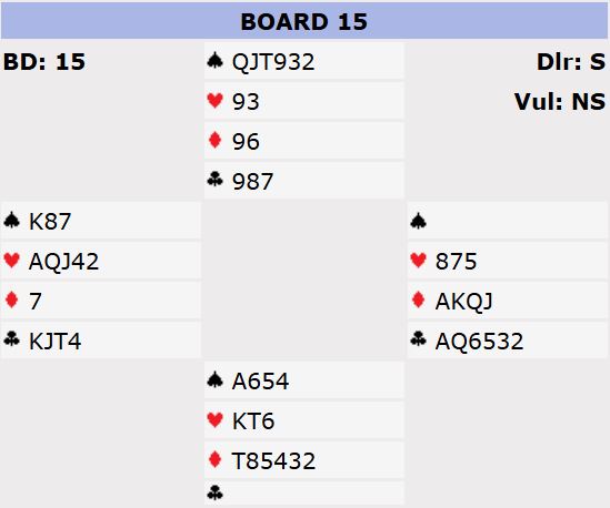 Ved det andre bordet hadde mine lagkamerater et godt spill, de stampet i 6 spar og slapp unna med -800. Men med vår bet ble jo spillet tapt med 14 IMP. Hvis storeslemmen hadde føket hjem ville det blitt 15 IMP den andre veien, så her var det 29 IMP i sving på ett spill!