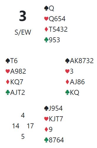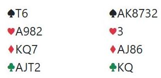 I forrige innlegg sutret jeg om en storslem som gikk bet i stikk en pga. av 5-0 sits i en sidefarge. Her kommer mer av den sorten. Dette spillet er interessant både i meldingene og for å legge en spilleplan. Forsøk selv å melde kortene best mulig med ditt og din makkers system:
