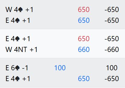 Vest åpnet med 1 kløver og øst viste sparfargen, Vest sa 1NT (12-14), og øst krevde til utgang med 2 ruter (XY-NT). Vest meldte da 2 hjerter og øst sa 2 spar, 5+ korts spar. Vest benektet trekorts spar med 2NT, og øst sa 3 spar, sekskorts farge. Nå kom en god melding fra min makker, 4 kløver som viser at han har maksimum, dvs. en god løft til 4 spar. Dermed gikk vi på til 6 spar.