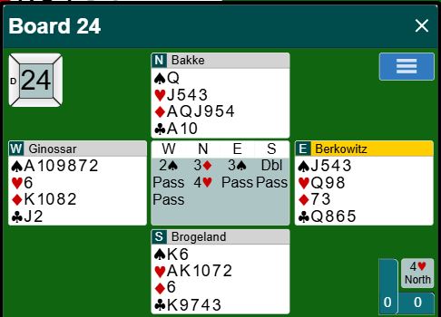 Da øst høynet vests 2 sparåpning til 3 spar etter innmeldingen 3 ruter fra nord doblet Brogeland med syds kort. Det ser normalt ut, han vil jo gjerne ha med kløverfargen i dette heller enn å lukke igjen øynene å si 4 hjerter. Da Bakke meldte 4 hjerter over doblingen gikk det pass rundt.
