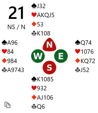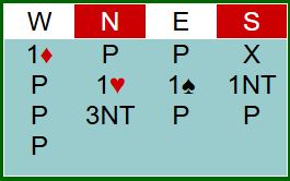 Slik gikk det med Nicolai-Heiberg Evenstad som syd og Stian Evenstad på nords plass. Syds 1NT er sterk grand, og i en slik situasjon hvor begge motstanderne har meldt og makker har passet i mellom de to meldingene er det vel ofte en litt sterkere grandhånd en vanlige 15 poengere i alle fall. Østs svar 1 hjerter viste minst firekorts spar (kløverføringer). Hva ville du spilt ut?