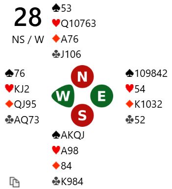Som allerede skrevet, det er ikke helt opplagt å vinne 4 hjerter selv om det sitter snilt. Ruteren sitter foran og kan etter hvert gi to ekstra stikk. Men en må i så fall komme seg over til syd etter å ha fått godspilt ruterstikk, og det må skje i spar. Så det kan fort koke ned til et valg i spar: har øst esset eller damen?