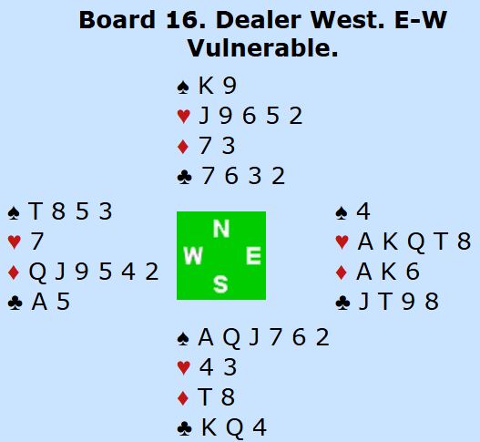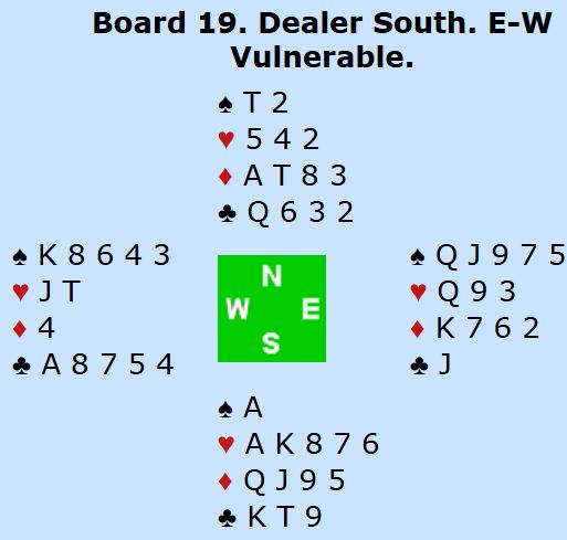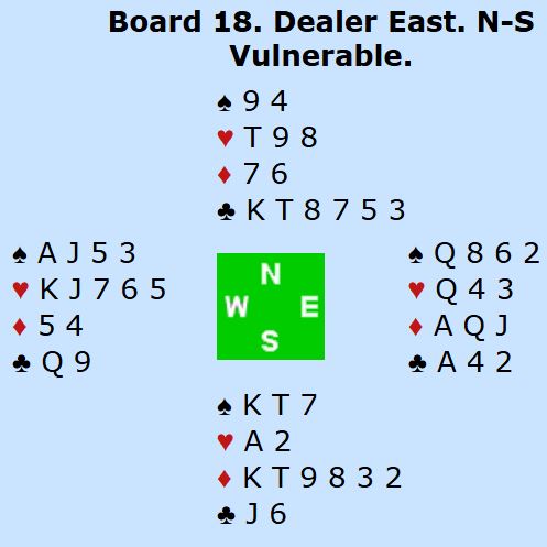 Det kom mer kløver til damen, kongen og esset. Da fulgte spar til knekten og spar ess, så hjerter. Syd vant for hjerter ess, men nå hadde ikke forsvaret mulighet til å godspille ruterstikk i tide, for to rutere forsvant fra øst på hjerteren.