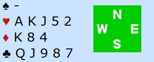 Vest er giver og ingen i sonen. Det går pass fra vest og nord før øst åpner med 1 hjerter. Melder du inn 2 ruter eller blir det pass? Igjen dreier det seg om et meldestilspørsmål. Mange liker å ha sekskorts farge for å gå inn på to-trinnet, eller hvis det bare er femkorts farge ha skikkelig åpning, eller bedre fordeling enn dette. Men ganske mange melder vel inn ganske automatisk med slike kort.