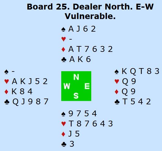 Dette er en god storeslem i hjerter. Det er veldig mange måter å vinne den på, og nesten ingen brukbar plan vil føre til bet slik som det sitter. Ved samtlige bord ble det hjerterkontrakt, og alle spilleførerne fikk tretten stikk.