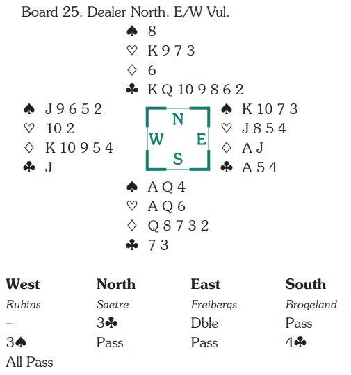 Som du ser doblet øst og vest meldte 3 spar. Ø/V har en bra sjanse i den kontrakten, og Anders (syd) gjorde det riktige da han kjempet med 4 kløver som bør kunne vinnes med de fleste normale hender nord kan ha for sin sperremelding. Slik kortene er, og med så sterk 4 kløveråpning som Magnus faktisk hadde er det dog en sjanse i 3NT, men som oftest vil å spille der bli fiasko og føre til et betelass. Hjerterkontrakt kan gå bra det også, men om motparten starter med to ganger ruter blir nord kort og rar i trumf.