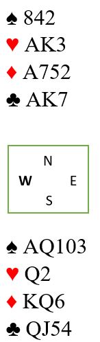 Men vi har glemt en tillegssjanse her. Så lenge øst har fire rutere er det faktisk en mulighet for å finne denne sparen. Det kan nemlig oppstå en sjow-up squeeze mot øst hvis ikke en har sånn bråhast med å spille tre ganger ruter og så ta nok en sparfinesse.