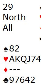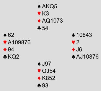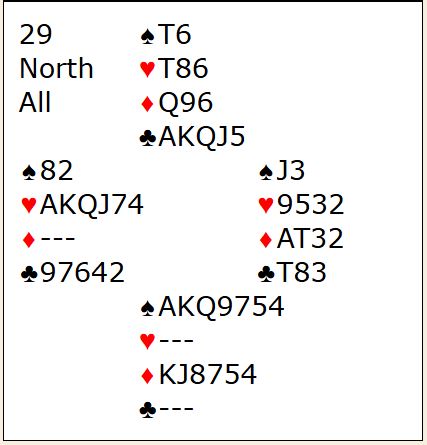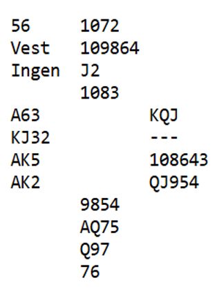 En av de tre som var i 6NT fikk kløver ut fra nord og hadde ingen mulighet for å vinne kontrakten. Det paret måtte tåle en nitrist score mens de to andre i samme kontrakt fikk hjerter ut og vant tolv stikk - delt topp.